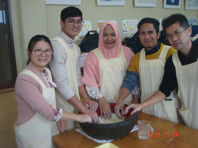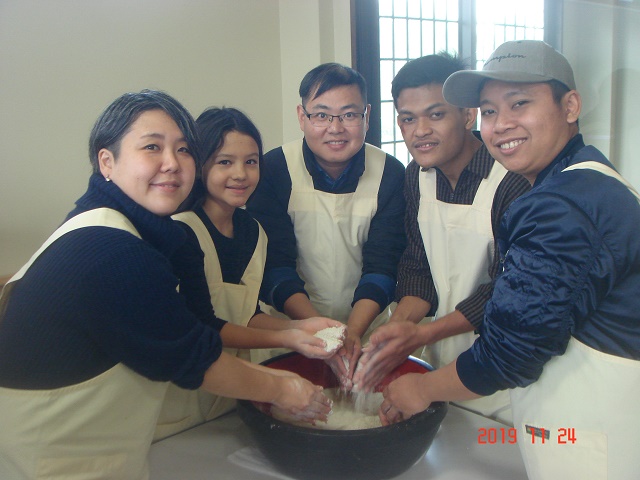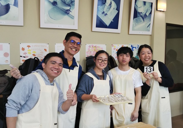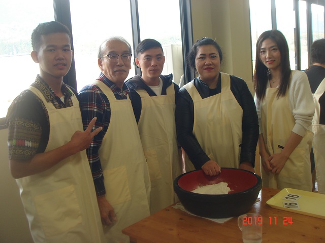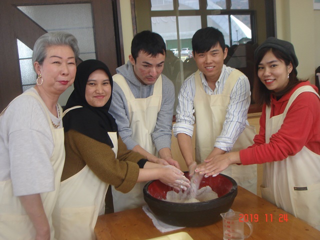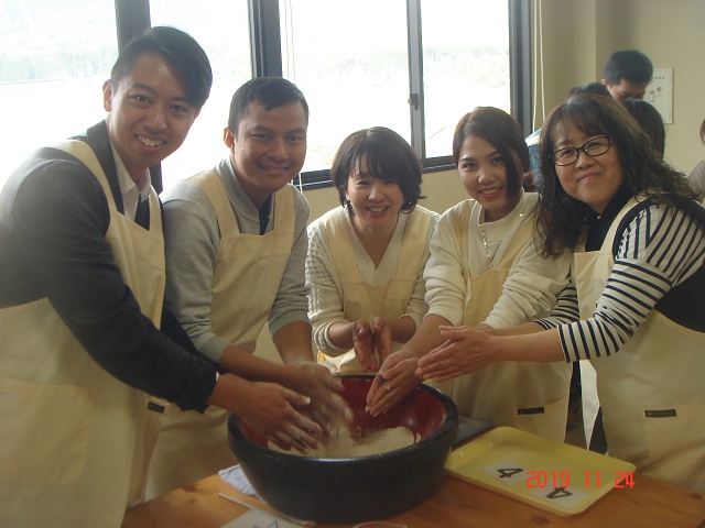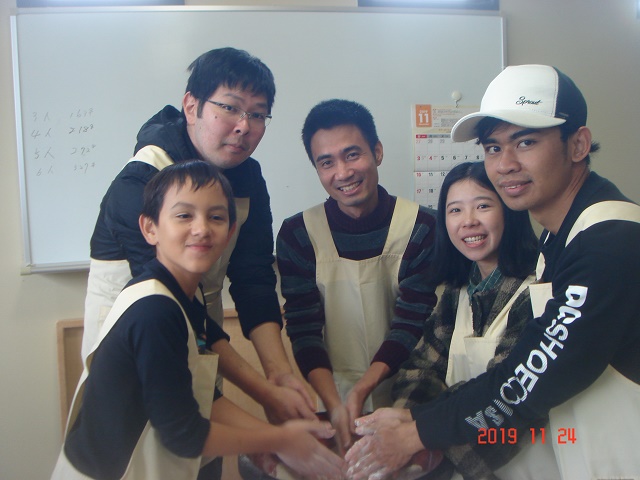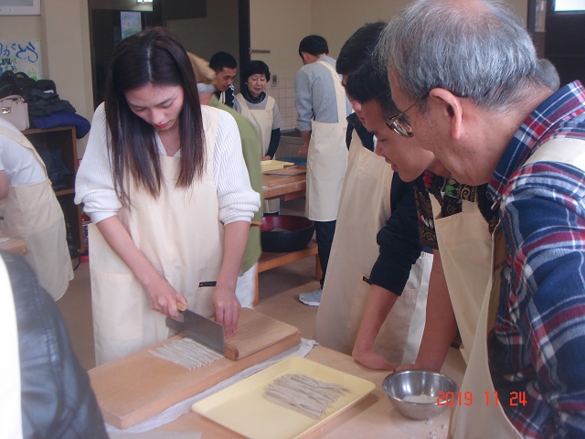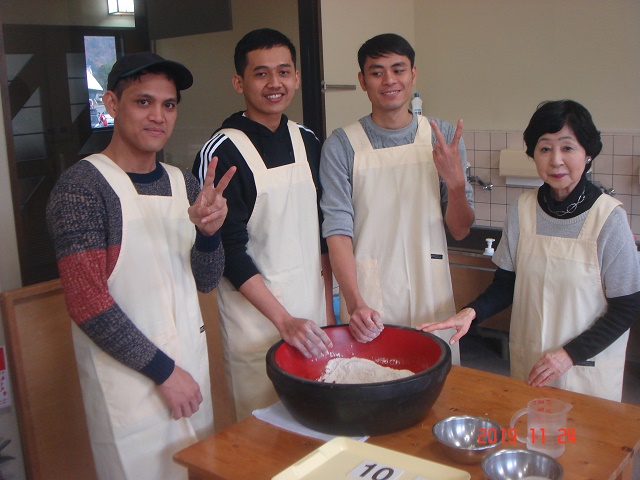 メタセコイア並木を満喫し、次に今回のメインイベントであるそば打ち体験ができる「体験交流センターゆめの」へ。いつも一緒に勉強しているグループの仲間とは違い、ここでは11のグループに分かれて新しい仲間と一緒にそばを打ちました。そばの打ち方を施設の人から丁寧に教えていただいたおかげで、ほとんどの人がそば打ちは初体験でしたが、どのグループもとても上手にそばが打てました。その後は、グループごとにそばをゆでてもらい、いざ実食。良く言えばこしがある!? 悪く言えば少し固いかな!? でも、やっぱり自分たちで打ったそばは格別。そばの風味もあってとてもおいしくいただきました。