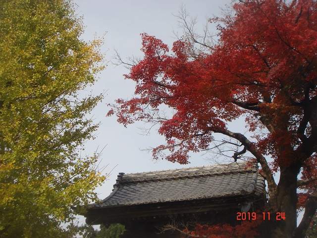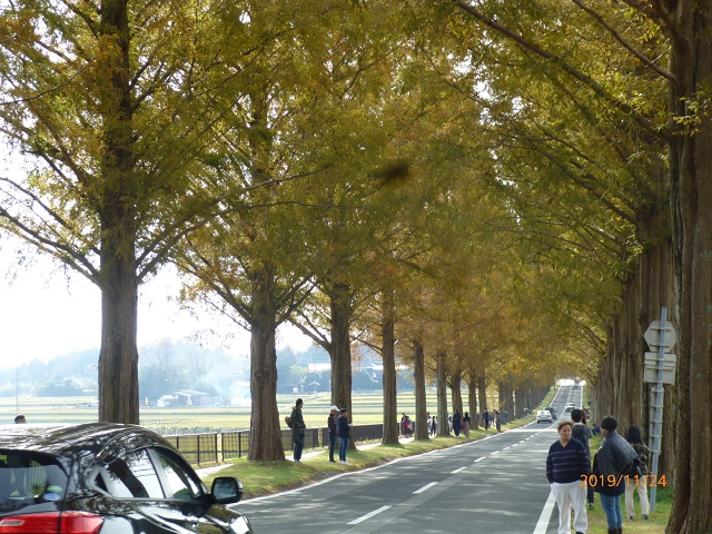 同じく今津にはマキノピックランドという農業公園があります。この公園を南北に通る約2.4キロの県道にはメタイセコイアが500本ほど植えられており「メタセコイア並木」として有名です。そば打ち体験の前に寄ってみることにしました。メタセコイア並木の紅葉は、ここ数年インスタ映えスポットとしても注目され人気の観光スポットです。11月下旬の日曜日ということもあり、観光客も車もいっぱい。公園から少し離れた並木道スタート地点の駐車場でバスからおり、並木道に向かいました。例年より気温が高いせいか紅葉はあまり進んでいませんでしたが、それでも一本道のメタセコイア並木は素晴らしく、車道を通る車に気を付けながら、それぞれが記念写真を撮りました。