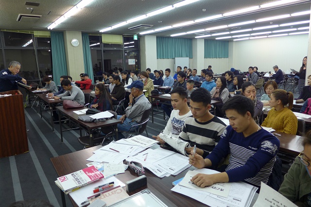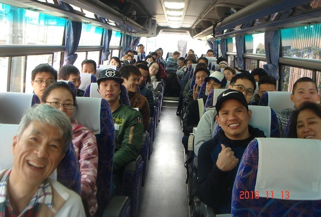 まずは、前日の日本語教室でオノマトペの講義がありました。内田先生が工夫を凝らして難しいオノマトペを解説、「つるつる」と「ざらざら」は写真用紙と紙やすりを触ってもらって体得してもらうといった方法で、皆さん、楽しみながらオノマトペを学びました。一夜明けて、早朝、草津市まちづくりセンターに集合、バスで出発しました。皆さんのにこやかな顔をご覧ください。