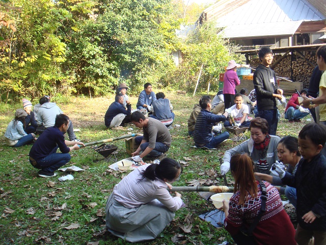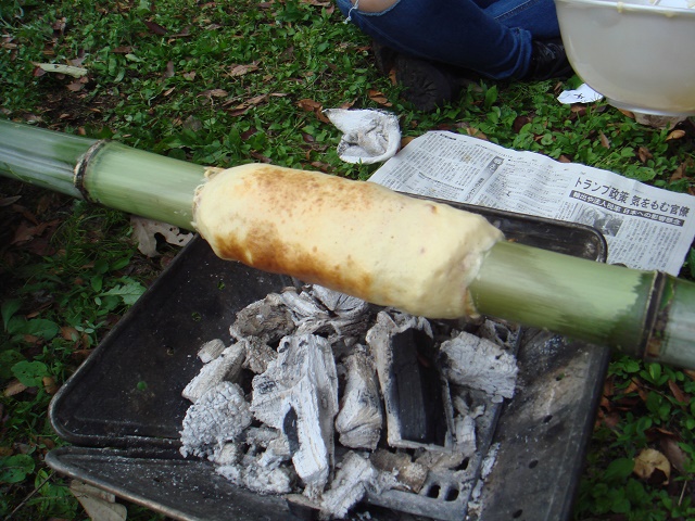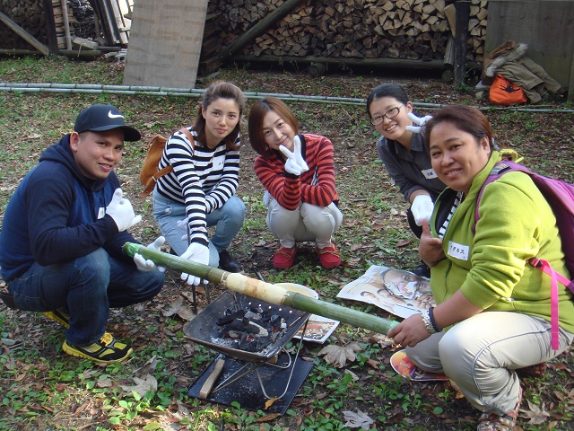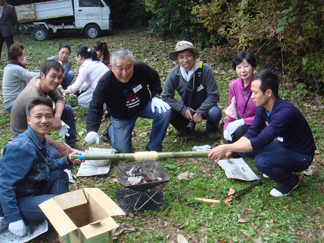クイズラリーが終了したら、いよいよ楽しみにしていたバウムクーヘン作りです。参加者は10班に分かれてこの課題に挑戦しました。火の起こしかた、材料の調合、心棒になる竹の前処理などスタッフさんの説明を受けたのち、にぎやかにスタートしました。