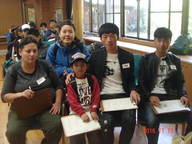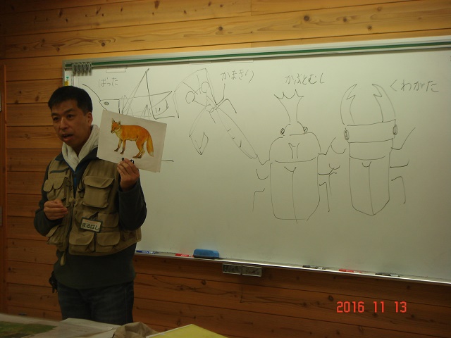 2016-11-13(日)、恒例の秋の遠足に出かけました。今年は文化庁助成事業の一環として、オノマトペ(擬音語、擬態語)を学習しながら自然を楽しもうという企画で、東近江市の「河辺いきものの森」に貸し切りバスで出かけました。
