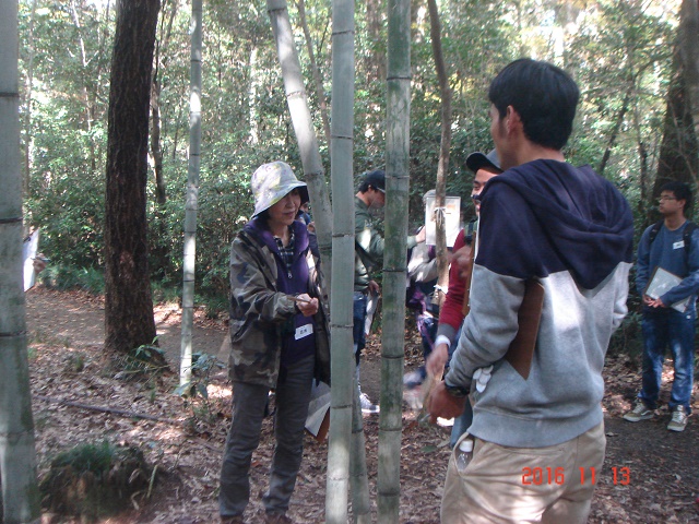その後、小グループに分かれて森の中を歩き回り、あちこちに掲示されているクイズを解いて回りました。中には、のこぎりで木を切るときの音、中空の竹をたたく音などは、人により、国により、異なったオノマトペで表現されることなど、楽しく勉強することができました。