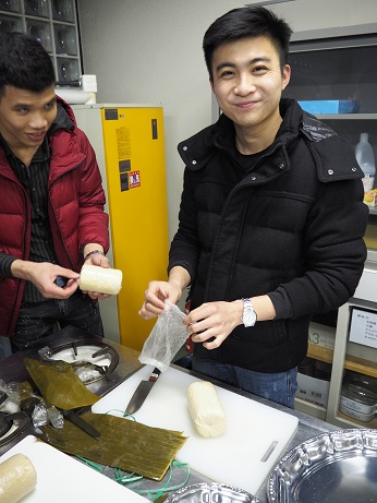 ベトナムチームは「チャールア」というハムと春巻きをお家で作ってきてくれました。チャールアは豚肉で、大きなバナナの葉に包まれていました。