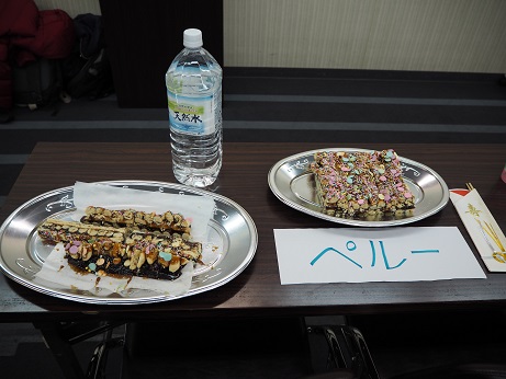 ペルーチームは「トゥロン」というお菓子を作ってきてくれました。小麦粉のクッキーを重ねた上にはちみつをかけてキャンディで飾っています。はちみつにはフルーツが入っているらしく、かなり甘そうな見た目に反して甘さのなかに爽やかさがあり食べやすかったです。