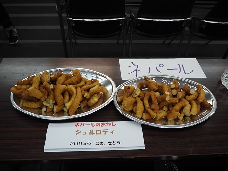 ネパールチームでは「シルロティ」というおやつを食べます。正月はお参りに行くだけで、4月に大きなパーティをします。