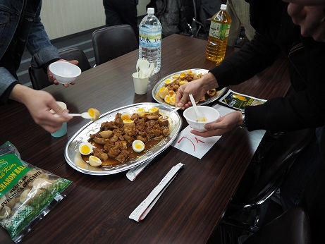 フィリピンチームは「アドボ」を作りました。鶏肉と玉ねぎを一緒にフライパンで炒めて、固ゆでの卵を加えて作ります。